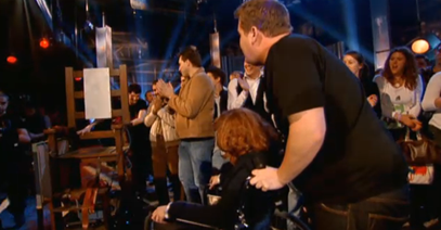 Corden bounds on, and apologises for the lack of Horne. Midway trough the apologies, Horne announces his arrival from off-camera. The crowd giggles as the camera turns to the delayed Thin One Of The Two. He is revealed to be tied to a bed frame as the crowd whoops with delight.